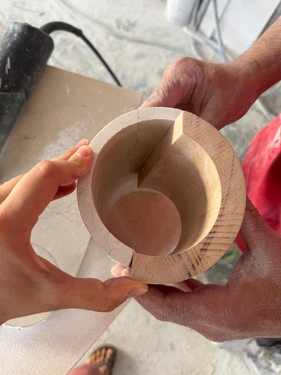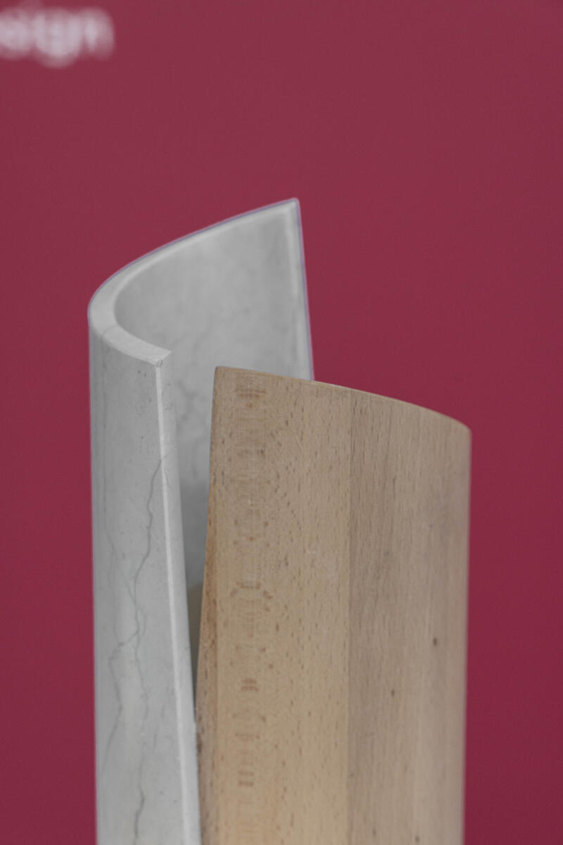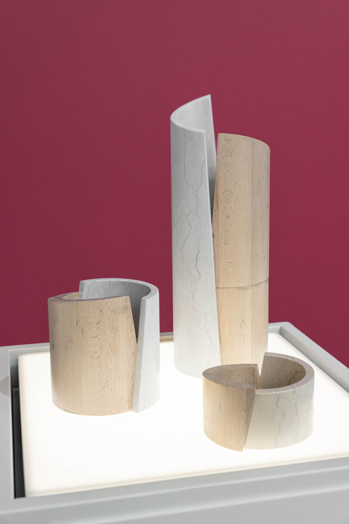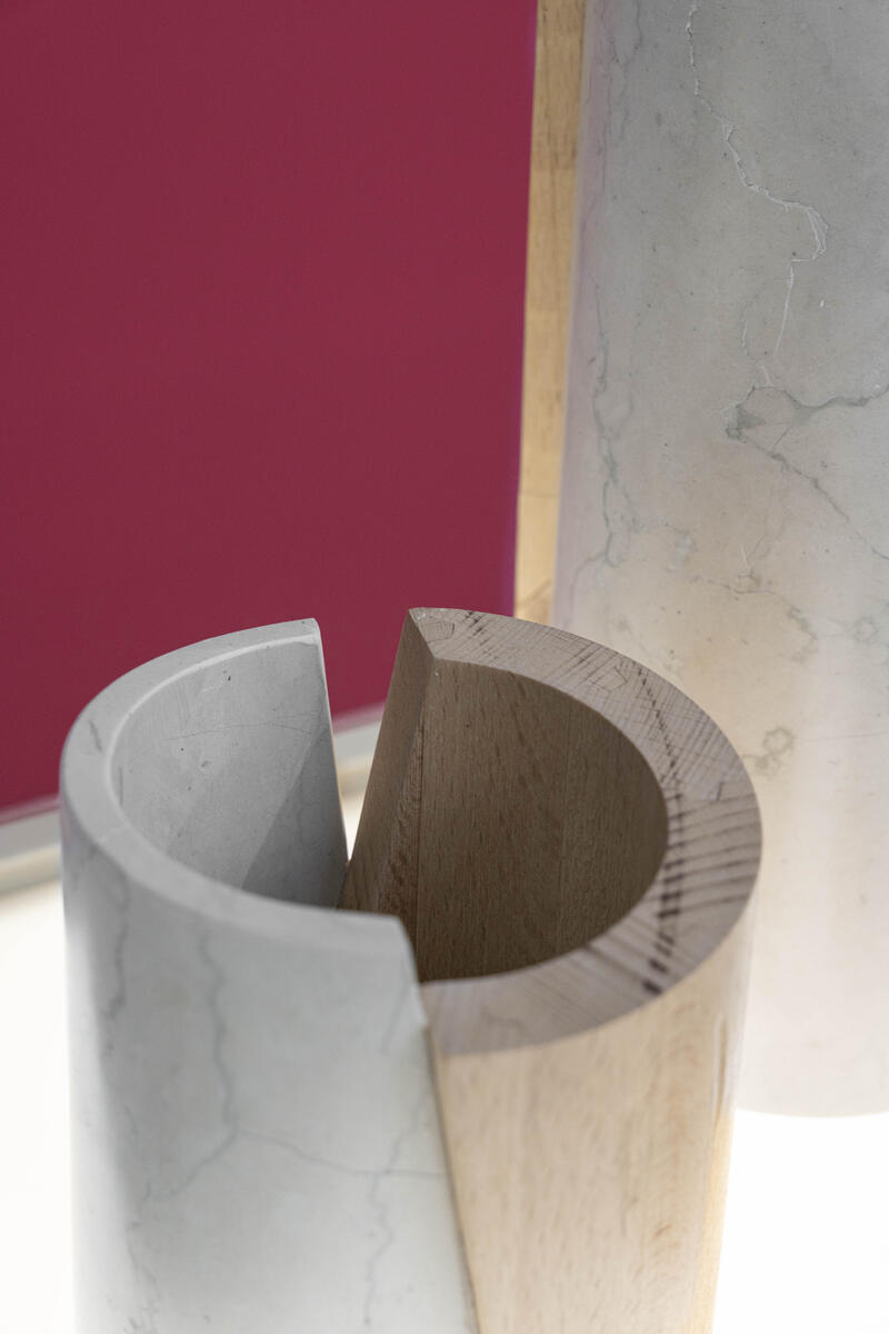 Nel pezzo più grande, invece, la Pietra della Lessinia Bianca è tagliata con un’inclinazione opposta ma analoga a quella del legno, creando l’illusione di una spirale continua che unisce i due elementi in un unico gesto fluido.